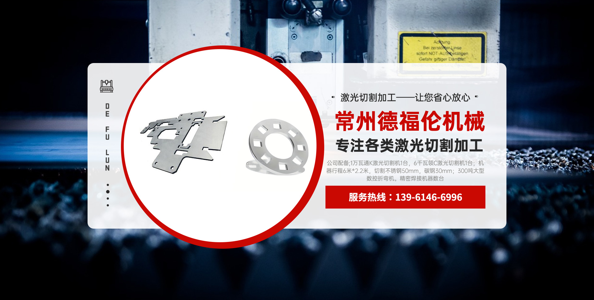常州德福倫機械有限公司成立于2014年12月19號,位于江蘇省常州市武進區遙觀鎮建農村劍童路56號西門;公司配備;1萬瓦通K激光切割機1臺,6千瓦領C激光切割機1臺;機器行程6米*2.2米,切割不銹鋼50mm,碳鋼30mm;300噸大型數控折彎機。精密焊接機器數臺。本公司可以承激光切割加工件、,精密折彎件、精密鈑金、專營配套的各類鐵板,不銹鋼板。長期積累的加工經驗,加上形成的質量管理體系和計劃管理程序,使我們公司的加工能力大大提高,滿足客戶所需,是我們公司的目標!公司奉行“以誠待人,服務為上,價格滿意”的宗旨。歡迎各位領導;老總前來洽談合作!